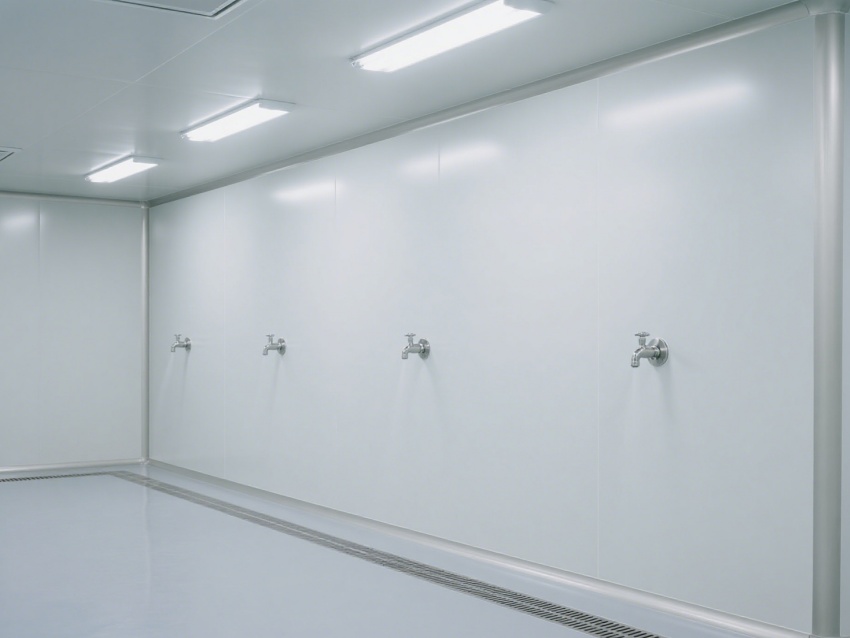本次呈現的無塵無菌車間效果圖,整體采用極簡工業風設計,墻面、地面、頂面均選用一體化抑菌潔凈板材,色調以醫用級純白為主,搭配淺灰金屬收邊,視覺上凸顯整潔通透感。?