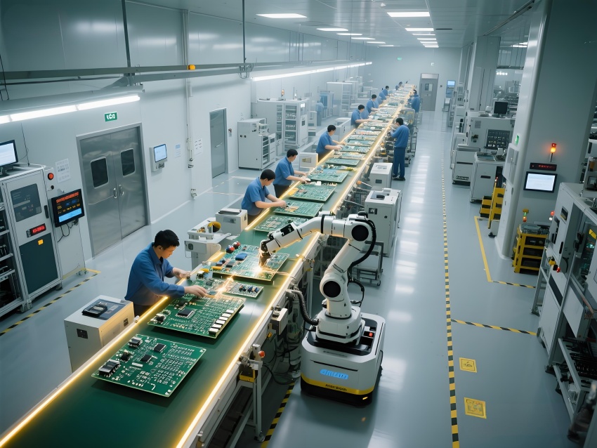 本車間以"精密工業美學"為設計主題,構建銀灰色主調的科技制造空間。頂棚矩陣排列的FFU單元形成蜂巢狀光影,與地面熒光綠流線導向標識構成三維潔凈動線。防靜電環氧地面嵌入銅絲導電網,墻面采用陽極氧化鋁板與可視壓差監測窗。核心SMT區配備全自動懸吊式貼片機群,紅色激光校準射線在設備間交織。黃光作業區采用琥珀色漫射照明,與普通區的冷白光形成鮮明功能區分。透明亞克力防塵簾分隔各工序段,AGV機器人沿藍色磁軌無聲穿梭。數據看板懸浮顯示實時良率與溫濕度參數,頂部螺旋風管配合地面回風口形成垂直層流。整體通過金屬冷質感與智能交互元素的碰撞,打造兼具工業嚴謹性與未來科技感的精密制造環境。