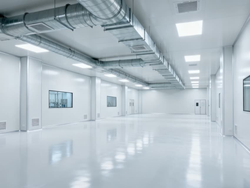 內部6個核心生產車間均為無設備空曠布局,按萬級潔凈標準打造:地面鋪設無縫環(huán)氧自流平,墻面采用食品級不銹鋼墻板,陰陽角做圓弧處理,杜絕積塵死角;空間柱網間距均勻,預留充足設備安裝點位與運維通道,滿足后續(xù)柔性生產需求;頂部吊頂整合新風系統(tǒng)與防眩光照明模塊,風口布局對稱規(guī)整,進一步強化空間的空曠感與規(guī)整性,為生物制藥生產的潔凈性、安全性與可擴展性奠定堅實基礎。